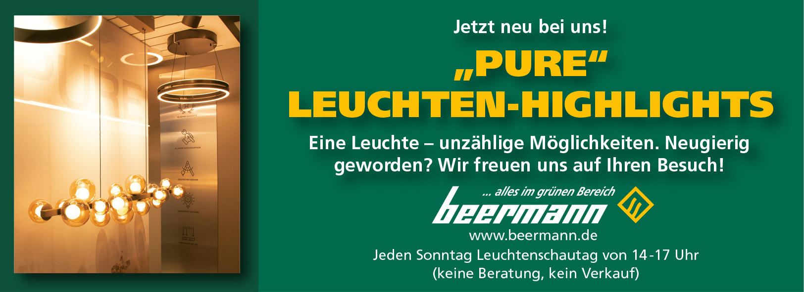 Unser Leuchtengeschäft Beermann Licht & Concept bietet auf einer Fläche von rund 450 m² eine große Auswahl an Wohnraum-, Außen- und Kinderleuchten von klassisch bis modern an. Geschenkideen und Dekorationen für den Wohnraum runden das Konzept ab. Schauen Sie vorbei und lassen Sie sich von unseren Serviceleistungen überzeugen: